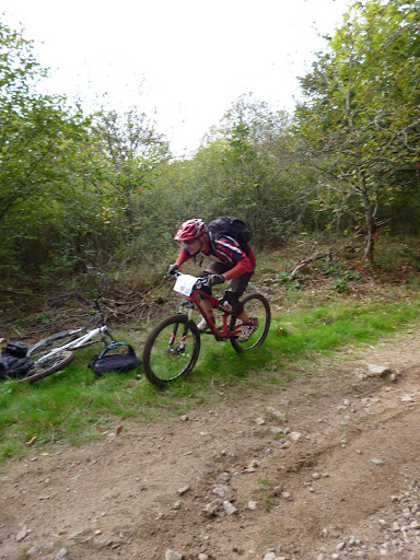 Au top je m’élance et me retrouve bien placé au départ du single. Le circuit est varié avec des parties tracées dans les bois, des portions de grands chemins, des cailloux, des chemins ravinés et, hélas pour moi des mégas flaques d’eau … Je vous raconterai les détails de vive voix.  Le fait est que je remonte sur mon vélo un peu plus lourd et humide et relance la machine à fond. Après une bonne partie dans les bois nous arrivons sur des coteaux et louvoyons  en montées et descentes entre les parcelles de vignes à en avoir le tournis. Je ne lâche rien et roule à toc. Je vois les premières maisons ; l’arrivée n’est plus loin. Coup de patins dans la cour, Ben baraka m’annonce ma 4ème place !