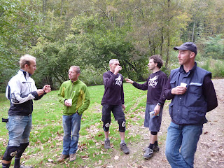 Lorsque tous les concurrents sont arrivés, une petite épreuve nous attend derrière la propriété, entre 2 tranches de saucissons, des gratons, de la saucisse beaujolaise…et du Beaujolais. La « 4X-Eliminator-Grass-Track » consiste  à faire 3  ou 4 tours d’un vieux terrain de tennis moussu et délabré et si possible d’arriver devant, tous les coups étant permis. Je gagne la 1ère manche, ce sera moins bon les 2 suivantes mais termine 6ème. Ne me demandez pas comment les points de cette épreuves sont calculés…même l’organisateur n’a pas compris l’usine à gaz qu’il a mise en place !